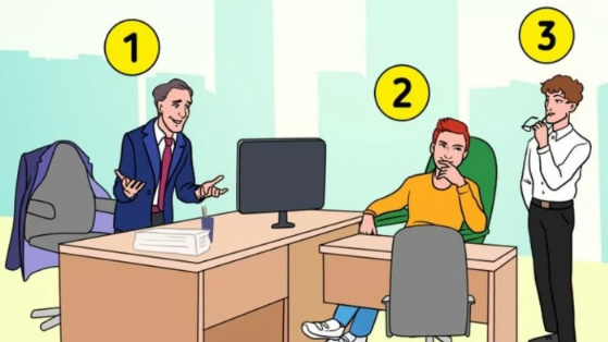 اس تصویر میں ایک دفتری کمرے میں 3 افراد موجود ہیں اور آپ کو بتانا ہے کہ ان میں باس کون ہے۔
